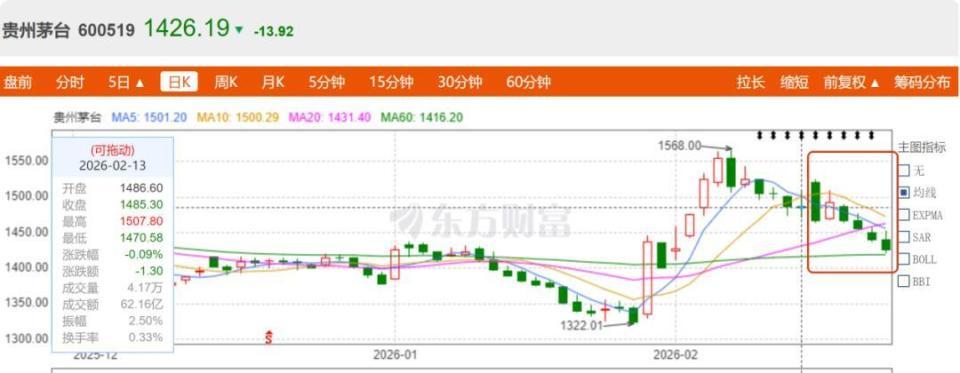 2025年年末和2026年年初,渠道改革后的茅台,初步完成了拿回定价权的任务,飞天茅台价格已从1400回升到1700。更关键的是,渠道改革刺激出了真实需求,飞天茅台终端动销超过去年同期。从近期不断走低的飞天茅台价格来看,茅台的改革显然还面临挑战,股价也在春节后一片葱绿。截至3月3日收盘,茅台股价为1426.19元,再跌0.97%,相比2月6日1568元的高点,跌幅超过9%,即便以春节后高点计算,跌幅也高达6.4%,最新市值为1.786万亿元。